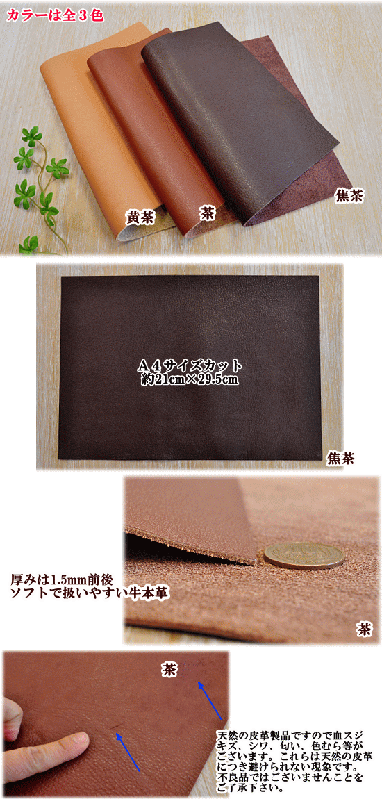 (例:1Mを5枚に分けて、1M・2Mを1枚ずつ、など)クラフト社 色牛袋物用(ミンクル)A4サイズ 約6DS 厚み約1.5mm全3色クラフト社さんが自信を持ってお勧めくださったエレガントな光沢と自然なシボを持つ牛革です。