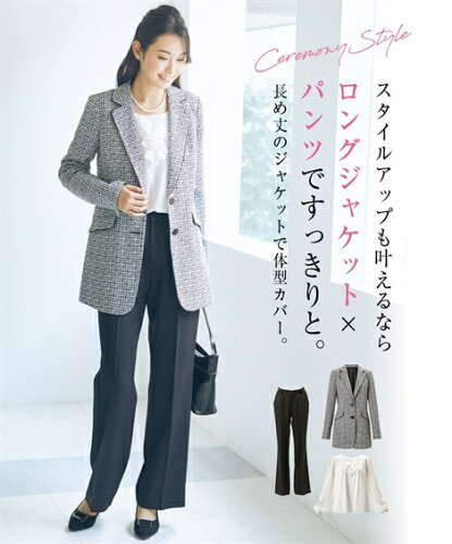 スッキリ見えのパンツはスラットさんの丈設定なのでつんつるてんにならずエレガントで女性らしい着こなしが叶います。