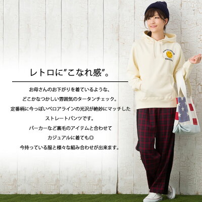 パーカーなど裏毛のアイテムと合わせてカジュアルに着ても◎ ◆サイズ ボトム丈:95cm、ウエスト:68cm(ゴム)、ヒップ:97+cm、前ワタリ:27+cm、後ワタリ:38cm、前股上:35cm、後股上:36cm、裾周り:43.5cm、股ぐり:80cm 規格本体 ポリエステル98% ポリウレタン2% 付属部分 ポリエステル100%先染めタータンチェック ベロアライン ストレートパンツ | レディースファッション/ ボトムス / パンツ レトロにこなれ感。