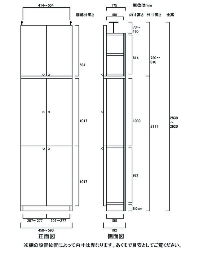 【オプション加工】1.5cm棚板ピッチ、幅木よけ、(配線用)裏板穴加工、タフ棚板穴加工 等 ※幅違い・高さ違い・奥行違いは全サイズ別一覧よりお選び下さい 薄型全面扉付き本棚 タフ棚板(厚さ2.5cm) 奥行19cm×高さ283.1〜292.1cm×幅45〜59cm サイズオーダー ウッドラック 幅は1cm単位で指定 薄型全面扉付き本棚 本体高さ211.1cm 突張棚高さ65cm 本体扉高さ203.4cm(全面扉) 突張棚扉高さ69.4cm(全面扉) ご注意 オプション加工を選択されても価格が自動計算されません。
